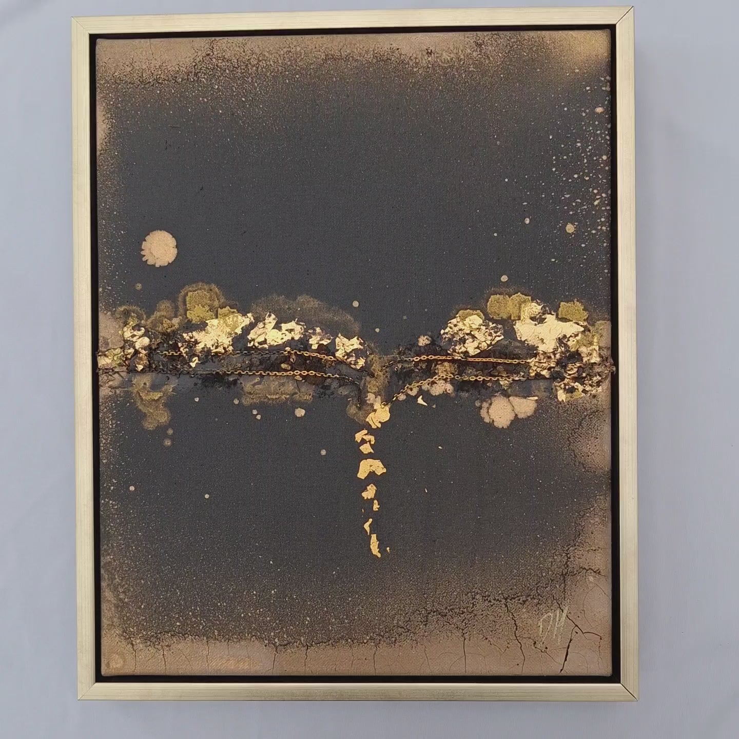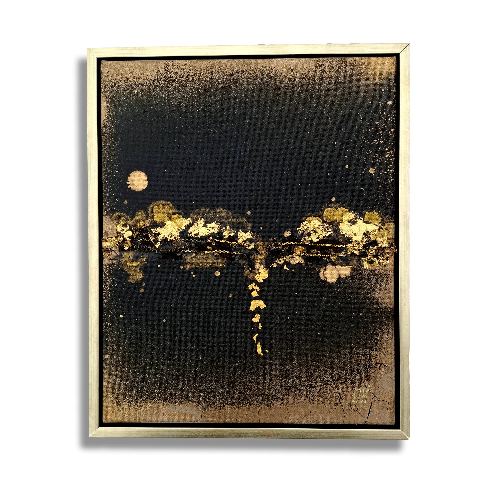 Acrylic, ink, spray, saw dust, alloy chain, 23.75ct gold leaf on canvas